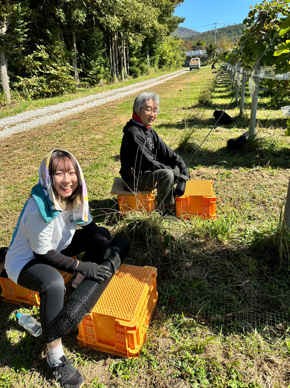 その後、ブドウ畑に移動し、午前から午後にかけて実際に作業体験をさせていただきました。今回私たちは、ブドウ脇にある防鳥ネットの回収作業を手伝わさせていただきました。私自身初めての体験だったため、最初は作業に苦戦していましたが、1時間2時間と時間を重ねるごとに要領を掴み、楽しく作業に取り組むことができました。また、作業の合間にはブドウの味見を、そして昼食にはワイン畑と北アルプスが望める素晴らしい眺望の施設内のバルコニーでお弁当と大きな大きなブドウをいただきました。とても甘く、気づいたら一房分ほどの量を食べていました。本当に美味しいブドウをありがとうございました。