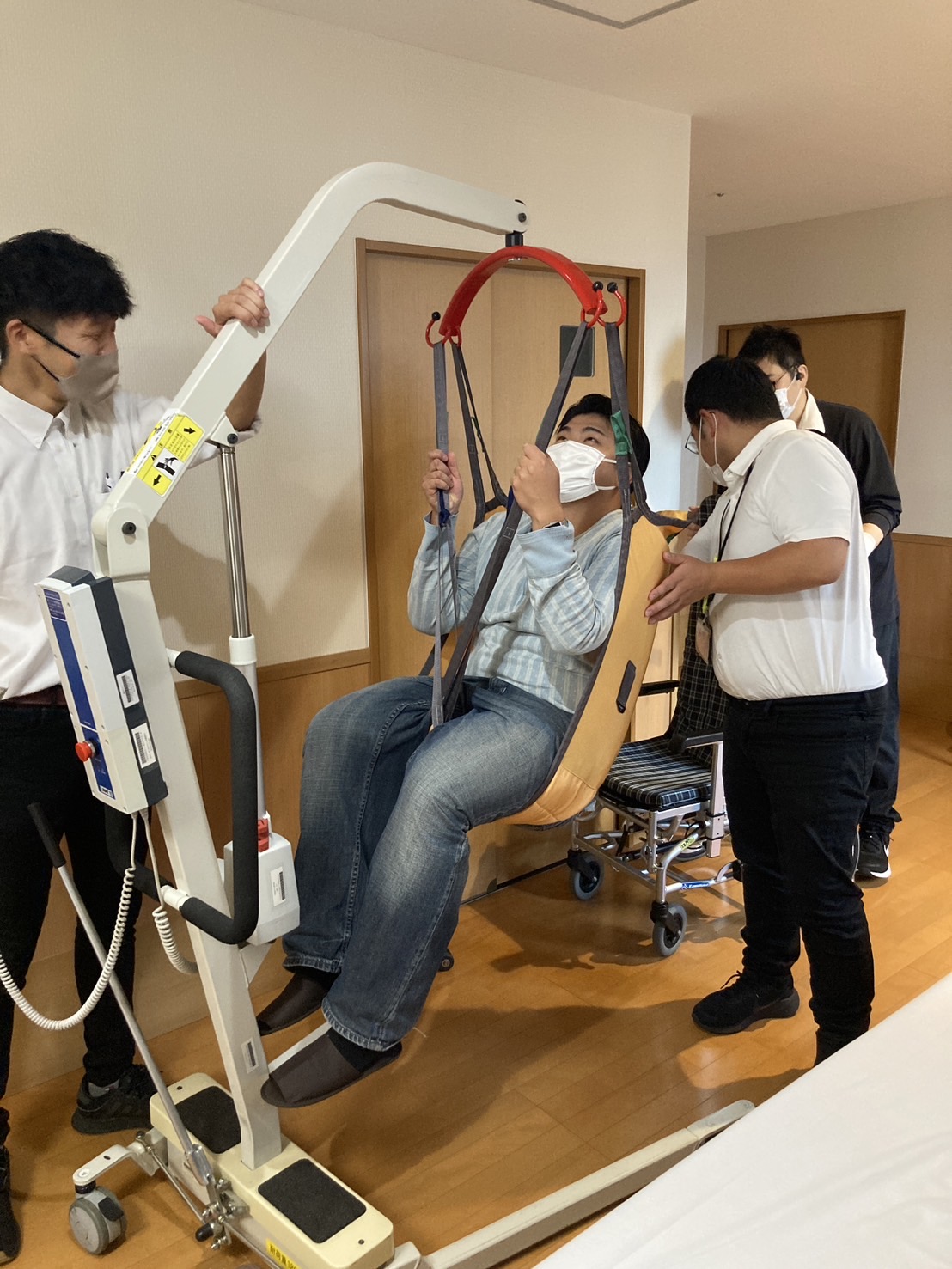 私たちはまず、「少子高齢化社会をトータルサポートする」を理念に掲げるサンビジョン様の事業概要や、現在積極的に導入されているICT機器の活用例や、人力のみの移乗を禁止し福祉用具を活用する「ノーリフティングポリシー」などを伺った後、複数の班に分かれ、施設内の視察をさせていただきました。その中でも特に、介護記録AIアプリ「CareWiz ハナスト」は、利用者様名と介助の内容を発話するだけで、記録に必要な言葉だけを読み取り記録化するというツールに関心を抱きました。これを用いることで、介助しながらでも簡単に記録ができ、業務時間の短縮に繋がっています。また、介護における職員の方の過度な身体面的負担を軽減する移乗用リフトやスライディングボードといった器具の使用方法についても実演いただき、私たちも実際に使わせていただきました。また、幼保連携型認定こども園も見学させていただいた際、こども園に通う子どもたちと介護施設の利用者様の交流機会について知り、施設内で「多世代交流」を実現できるグレイスフル塩尻様ならではの魅力を感じました。
