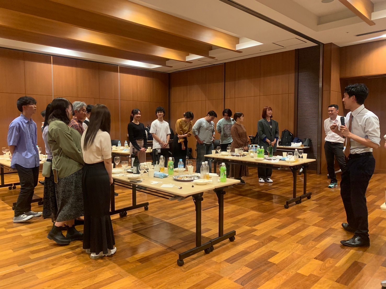 最後には、グレイスフル塩尻の交流ホールにて、美味しいお料理と共に、サン・ビジョン様のサンサンワイナリーが製造するワインを複数種類いただきました。その際、ワイナリーの醸造家である田村様に、それぞれのワインのご説明をしていただきました。ゼミ生は皆、職員の方々とのお話を楽しみながらとても良い時間を過ごさせていただきました。