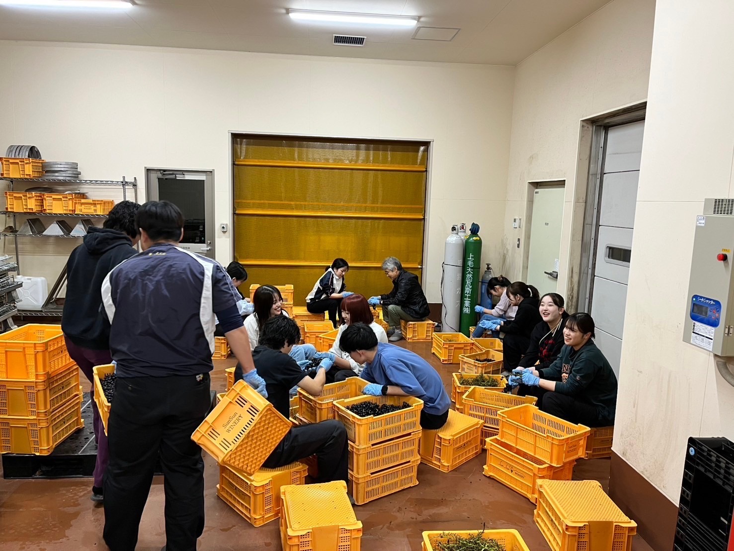 その後は、ぶどうの果実を手作業で房から外すという手もぎ体験をさせていただきました。ぶどうを収穫した際に付いている梗はワインの香りや味に雑味が出てしまうため、サンサンワイナリー様では手作業で丁寧に梗を取り除いています。天候悪化のため、当初予定していた外でのぶどうの収穫体験は出来ませんでしたが、こだわりの製造手法の一部に関わらせていただくという大変貴重な経験となりました。